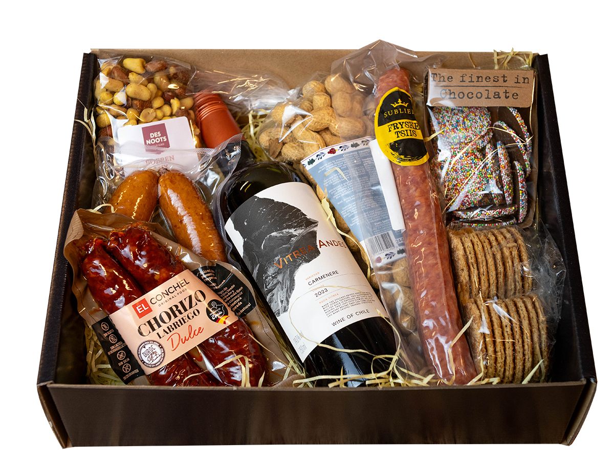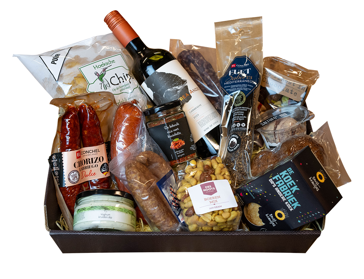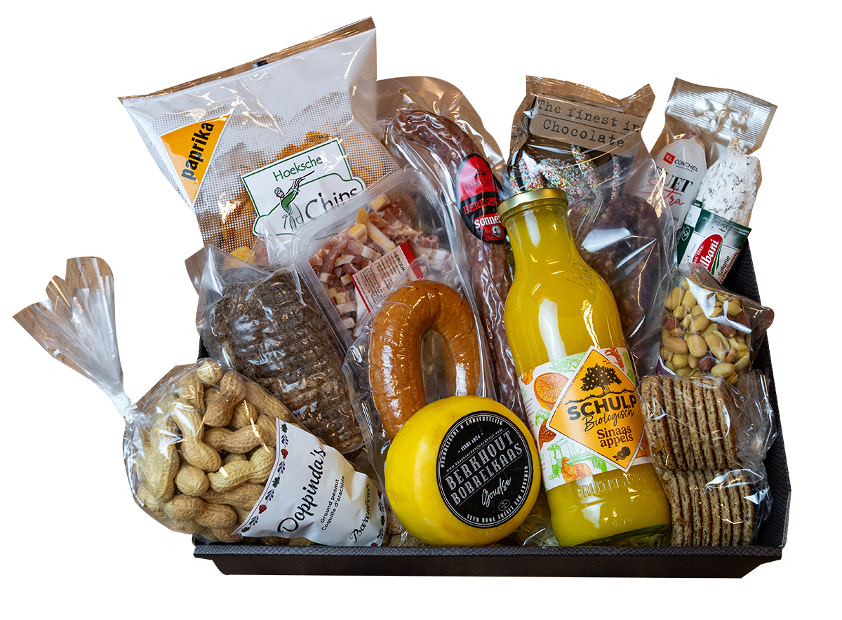 Paprika chips, Berenburg worst, Doppindas, Varkensrollade, Boerenkaas, Aioli, Chocolade Musket flikken, Fuet, Boerenmix pinda’s, Stroopwafels, Rookworst, Spekjes, Groninger metworst en een Galbanetto.